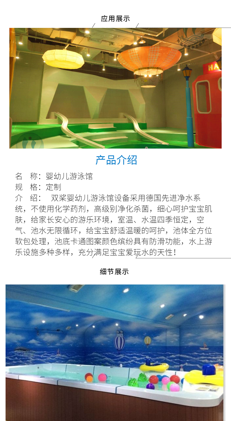 公司具備年產200套可拼裝式嬰幼兒游泳館、鋼結構泳池、拼裝式泳池;安裝150套水處理工程,安裝300套商用空氣能熱水工程,安裝100000平方泳池墊層與50000平方軟膜防水吊頂的生產施工能力,是目前國內最具規模的泳池制造廠商。多年來公司不斷通過技術培訓,加強行業交流與合作;我司一直倡導的“智慧游泳場館整體解決方案”為中國節能減排的新能源領域和國家體育健身游泳行業的終端用戶和合作商提供長期技術支持與實踐經驗。