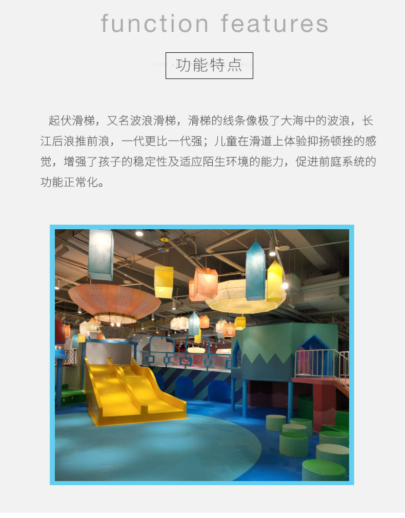 起伏滑梯,又名波浪滑梯,滑梯的線條像極了大海中的波浪,長江后浪推前浪,一代更比一代強;兒童在滑道上體驗抑揚頓挫的感覺,增強了孩子的穩(wěn)定性及適應陌生環(huán)境的能力,促進前庭系統的功能正常化。