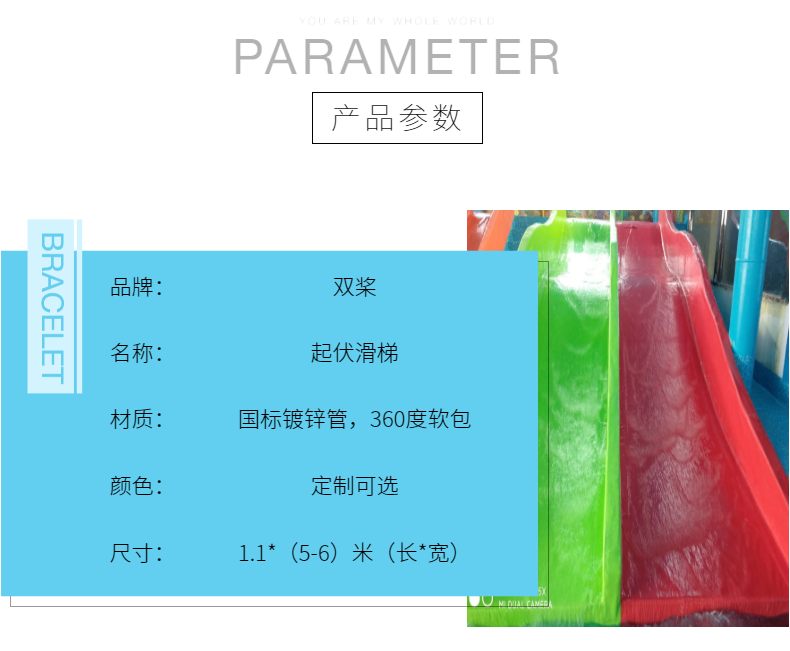 滑梯全部用扣件連接,采用360度軟包,表面沒有任何尖銳物凸出,每個部件均有多個型號和多種顏色選擇;也可以根據客戶的需要進行個性化設計、生產。本產品色彩鮮艷、不易褪色、高強度、防靜電、耐磨、耐曬、耐老化、防裂,結構安全耐用,滑梯設計巧妙、色彩搭配和諧,各個部件的巧妙結合,給孩子帶來安全、歡樂和活潑的感受。
