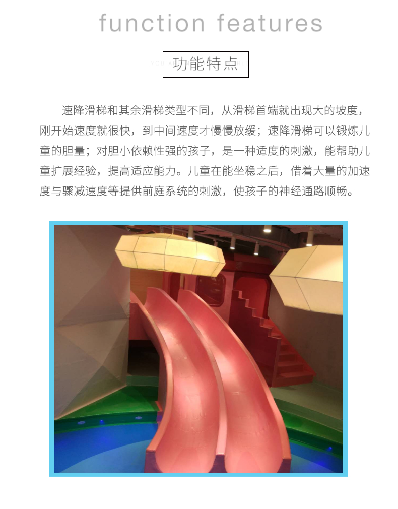 細節介紹:速降滑梯和其余滑梯類型不同,從滑梯首端就出現大的坡度,剛開始速度就很快,到中間速度才慢慢放緩;速降滑梯可以鍛煉兒童的膽量;對膽小依賴性強的孩子,是一種適度的刺激,能幫助兒童擴展經驗,提高適應能力。兒童在能坐穩之后,借著大量的加速度與驟減速度等提供前庭系統的刺激,使孩子的神經通路順暢。