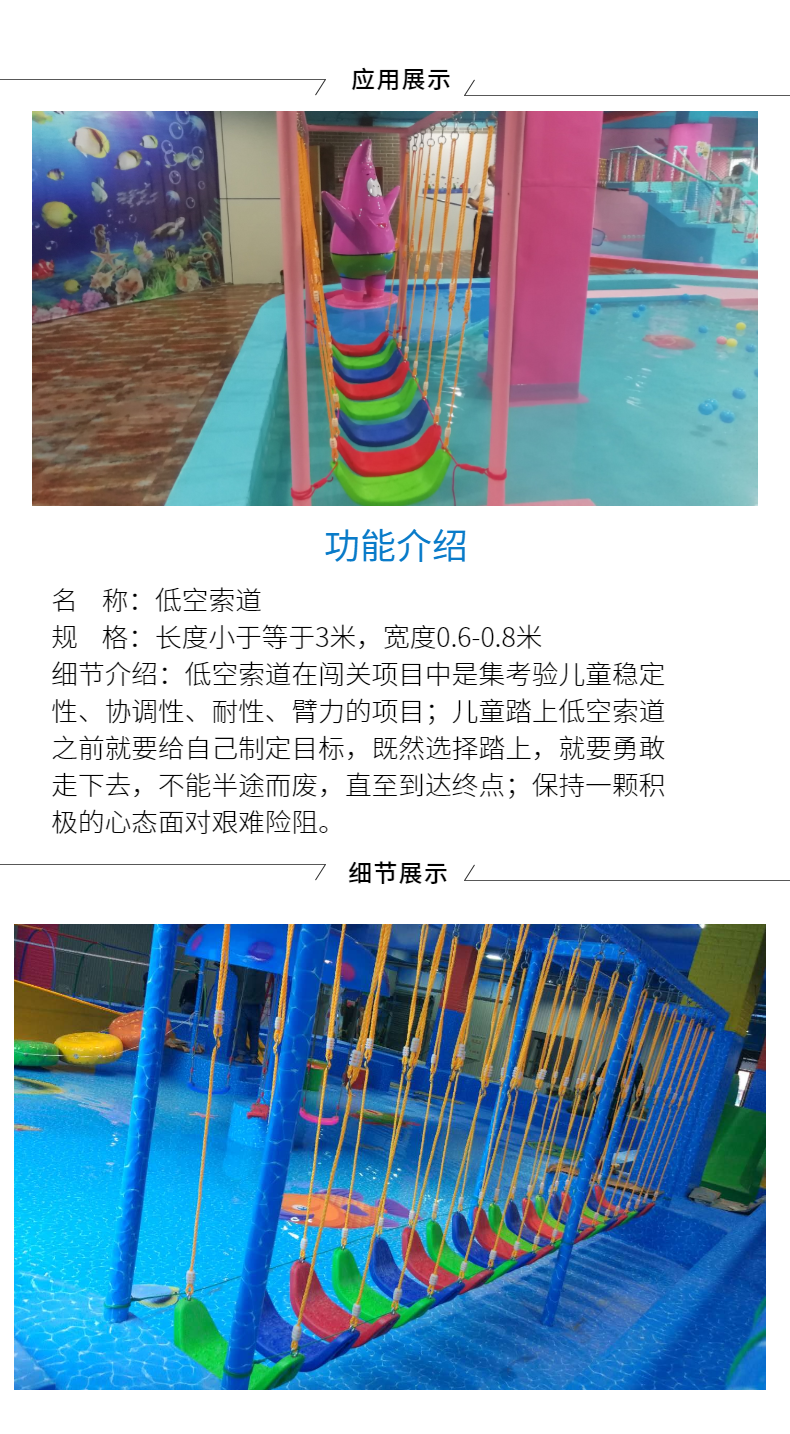細節介紹:低空索道在闖關項目中是集考驗兒童穩定性、協調性、耐性、臂力的項目;兒童踏上低空索道之前就要給自己制定目標,既然選擇踏上,就要勇敢走下去,不能半途而廢,直至到達終點;保持一顆積極的心態面對艱難險阻。