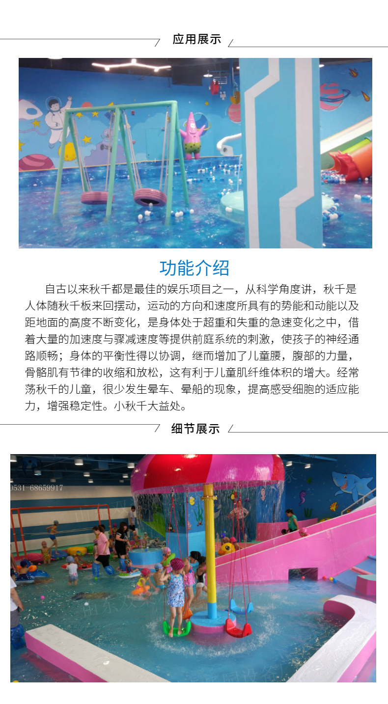 細節介紹:自古以來秋千都是最佳的娛樂項目之一,從科學角度講,秋千是人體隨秋千板來回擺動,運動的方向和速度所具有的勢能和動能以及距地面的高度不斷變化,是身體處于超重和失重的急速變化之中,借著大量的加速度與驟減速度等提供前庭系統的刺激,使孩子的神經通路順暢;身體的平衡性得以協調,繼而增加了兒童腰,腹部的力量,骨骼肌有節律的收縮和放松,這有利于兒童肌纖維體積的增大。經常蕩秋千的兒童,很少發生暈車、暈船的現象,提高感受細胞的適應能力,增強穩定性。小秋千大益處。